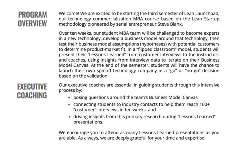 Thank you for your interest in supporting Loyola and helping to guide our students through the Lean Launchpad process. Your help, guidance, and expertise is a critical component of our student's success and ability to bridge the gap between their business studies and technical/industrial industries. We can't do this without you.
