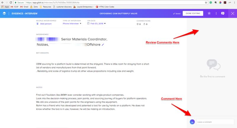 You can also use the side bar to comment on an evidence (interview) or assumption (Business model canvas element) detail page