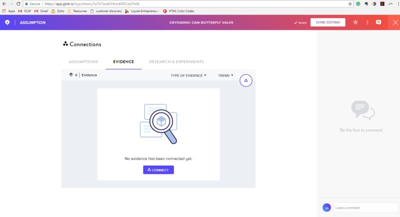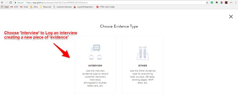 The basic structure of GLIDR uses a card structure (similar to Trello) to track 'assumptions' which are the building blocks of the business model canvas and 'evidence' which are the unit of validation. The log of an interview, for instance, would be considered a piece of 'evidence.' The card structure allows users to map relationships between different assumptions and pieces of evidence in a matrix or network rather than a linear relationship. For instance: one piece of 'evidence' can shed light on several assumptions and potentially in different ways.